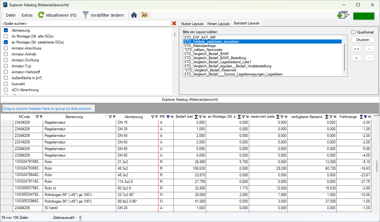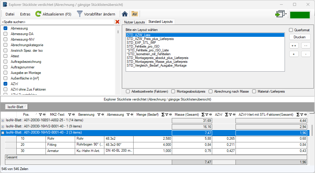 Die Filterung auf Materialkennzeichen erlaubt später das Erstellen separater Listen für unterschiedliche Materialien (Armaturenlisten, Halterungslisten usw.). Innerhalb der Stückliste werden mit Hilfe der "Bereitstellungsart" (BA) wichtige Einstellungen für die spätere Auftragsabwicklung vorgenommen. Über entsprechende Kurzbezeichnungen wird festgelegt, ob es sich bei der jeweiligen Position um eine vom Auftragnehmer zu liefernde Position handelt oder ob die Position vom Auftraggeber beigestellt wird. Weiterhin ist hinterlegt, ob die Position in der Vorfertigung (Werkstatt) oder auf der Baustelle angeliefert werden soll. Eine sichere Revisionsverwaltung für Isometrien ermöglicht es Mengenänderungen an einzelnen Stücklistenpositionen über die gesamte Laufzeit des Projektes nachzuvollziehen.