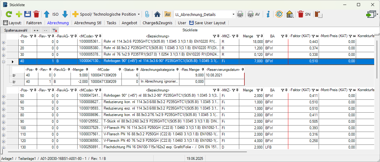 Wie die Montagefortschrittskontrolle kann auch die Abrechnung nach Zeitfaktoren, Einheitspreisen oder Masse vorgenommen werden. Die Stücklistenpositionen werden dazu mit Zeitfaktoren und/ oder